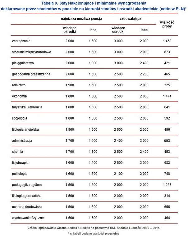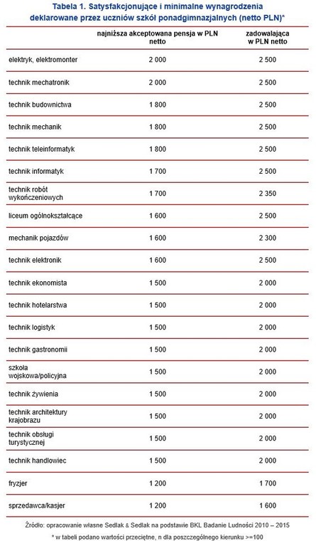 Okazuje się, że uczniowie różnych kierunków mają odmienne oczekiwania płacowe. Uczący się na fryzjerów i sprzedawców zadeklarowali, że są w stanie podjąć pracę, w której ich zarobki wyniosą 1 200 PLN netto, natomiast zadowoli ich wynagrodzenie w wysokości kolejno 1 700 PLN i 1 600 PLN miesięcznie. Najwyższe oczekiwania płacowe mieli uczniowie techników o profilu elektrycznym, mechatronicznym, budowniczym, mechanicznym i teleinformatycznym. Najniższa możliwa pensja, za którą podjęliby pracę, wahała się od 1 800 do 2 000 PLN netto miesięcznie, natomiast tę grupę uczniów zadowoli przeciętnie 2 500 PLN miesięcznie i więcej. Co ciekawe, uczniowie liceów ogólnokształcących mieli wyższe wymagania płacowe niż technicy ekonomiści, hotelarstwa czy logistyki, mimo że nie posiadają wykształcenia kierunkowego.