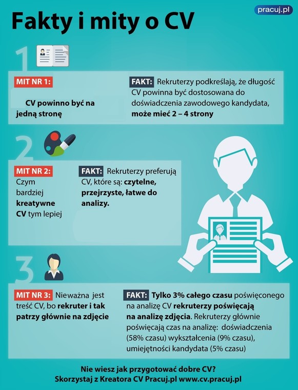 Wbrew częstym opiniom kreatywne CV nie pomogą kandydatom w znalezieniu pracy ale wręcz utrudnią pracę rekruterom. Kandydat ubiegający się o pracę powinien zaprezentować swoje doświadczenie w przystępnej formie. Ze względu na dużą liczbę otrzymywanych aplikacji, rekruter oczekuje od kandydatów, aby opisali swoje doświadczenie zawodowe i kompetencje w czytelny sposób. Aby stworzyć czytelne CV warto skorzystać z bezpłatnego Kreatora CV dostępnego na Pracuj.pl, który przeprowadza pracownika przez poszczególne etapy opracowania CV zapewniając zarazem przejrzystą szatę graficzną.