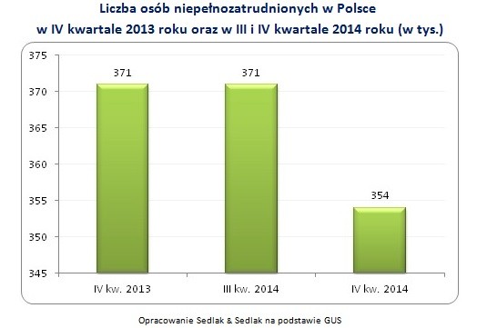Jak wynika z danych GUS, w IV kwartale 2014 roku liczba osób niepełnozatrudnionych w Polsce wyniosła 354 tys. Oznacza to spadek o 17 tys., tj. 4,6% rok do roku, jak i w ujęciu kwartalnym.