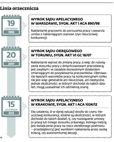 Na gruncie art. 12 ust. 1 u.z.c.n.k. zakazane jest nakłanianie do niewykonywania lub nienależytego wykonywania obowiązków pracowniczych. Odmiennie zatem niż w art. 12 ust. 2 u.z.c.n.k. nie zabrania się namawiania zatrudnionych do wypowiadania angaży. Kierowanie oferty pracy na korzystniejszych warunkach do pracowników konkurencyjnego przedsiębiorstwa należy do codziennej praktyki i pozostaje w zgodzie z zasadami prawidłowej gospodarki rynkowej. Podstawowym prawem pracownika jest podjęcie decyzji, dla kogo i na jakich warunkach świadczy pracę. Nie negując tego, że przejęcie pracowników konkurencyjnego przedsiębiorcy może czasem przybierać postać czynów nieuczciwej konkurencji, przyjąć należy, że zawężone to być powinno do takich przypadków, w których rywalizujący przedsiębiorca posługuje się nieuczciwymi metodami (oszustwem, podstępem, wprowadzeniem w błąd), bądź gdy nieuczciwy jest cel, do którego dąży. Jako przykład tego ostatniego można podać przejęcie pracowników z zamiarem doprowadzenia do bankructwa innego przedsiębiorcy i zwolnienia tych pracowników po osiągnięciu tego celu. Takie działania po stronie pozwanego jednak nie zaistniały. Wskazywane przez skarżącą spółkę okoliczności nakłaniania pracowników do zmiany zatrudnienia (wielokrotne telefony i rozmowy) nie wyczerpują w ocenie sądu apelacyjnego znamion czynów zabronionych przez ustawę.
