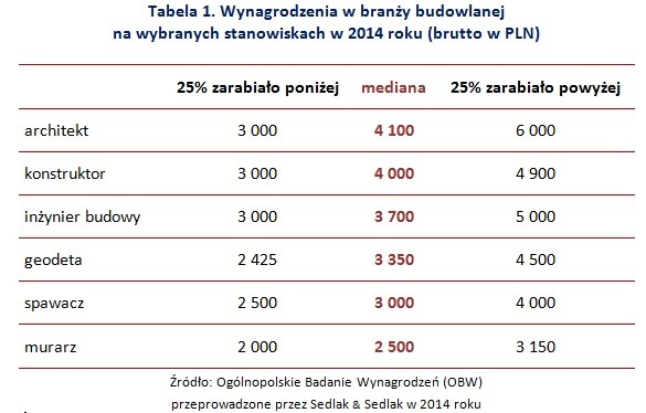 Spośród wybranych zawodów, warto zwrócić uwagę na zarobki architektów -mediana ich miesięcznych wynagrodzeń wyniosła 4 100 PLN brutto. Znacznie niższe wynagrodzenia otrzymywali pracujący fizycznie murarze - mediana ich wynagrodzeń wyniosła 2 500 PLN. Natomiast co czwarty murarz otrzymywał do 2 000 PLN miesięcznie. Należy jednak pamiętać, że w przypadku murarzy często zdarzają się przypadki wypłacania części wynagrodzenia bez formalnej umowy. Szczególnie w mniejszych przedsiębiorstwach, czy też mikrofirmach występuje szara strefa. Aby uniknąć opodatkowania i składek do ZUS, przedsiębiorcy wypłacają część pensji „pod stołem”. W związku z tym tacy pracownicy nie znają faktycznej kwoty swoich zarobków brutto. Trudno oszacować, na ile miało to wpływ na podawane w badaniu kwoty.