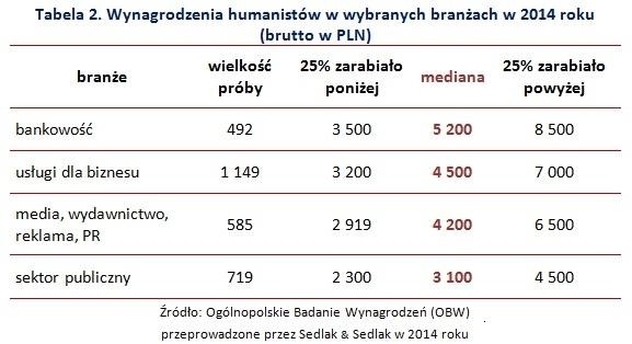 Bankowość to jedna z branż, w której wynagrodzenia humanistów były wysokie, mediana płac wyniosła tam 5 200 PLN brutto. Pracownicy usług dla biznesu, którzy posiadają wykształcenie humanistyczne, zarabiali przeciętnie 4 500 PLN. O 300 PLN mniej zarabiali pracownicy mediów i agencji reklamowych.