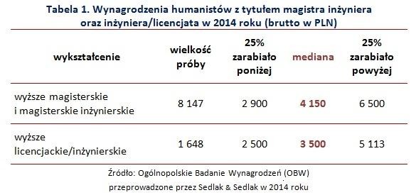 Co drugi absolwent studiów humanistycznych zarabiał w 2014 roku nie mniej niż 4 000 PLN — wynika z Ogólnopolskiego Badania Wynagrodzeń przeprowadzonego przez Sedlak & Sedlak. Magistrzy zarabiali przeciętnie o 650 PLN więcej niż pracownicy z tytułem zawodowym licencjata.
