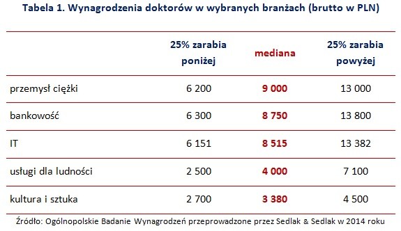 Najwyższe pensje otrzymywali doktorzy zatrudnieni w przemyśle ciężkim oraz bankowości. Na trzecim miejscu znalazła się natomiast branża IT. Na drugim biegunie niezmiennie pozostawała kultura i sztuka – tam wynagrodzenie co drugiego doktora nie przekraczało 3 380 zł.