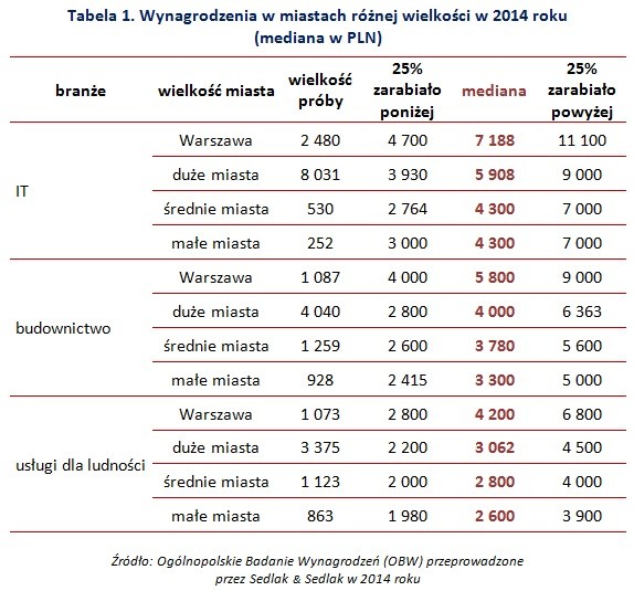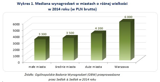 W średnich miastach (20-100 tys. mieszkańców) wyniosła ona 3 500 PLN. W dużych miastach (100 tys. mieszkańców i więcej), przeciętnie pracownicy zarabiali 4 200 PLN, a w Warszawie 6 000 PLN brutto – wynika z Ogólnopolskiego Badania Wynagrodzeń przeprowadzonego przez Sedlak & Sedlak w 2014 roku.