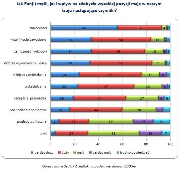 Ponad 90 proc. osób jest zdania, że rozbudowana sieć kontaktów ma bardzo duży lub duży wpływ na zdobycie wysokiej pozycji w naszym kraju. Mniejsze znaczenie w tym względzie Polacy przypisują m.in. kwalifikacjom zawodowym, dobrze wykonywanej pracy, czy wykształceniu.