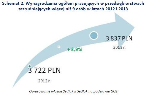 Przeciętne miesięczne wynagrodzenie w sektorze przedsiębiorstw (czyli liczone dla firm, w których pracuje ponad 9 osób) wyniosło w 2013 roku 3 837 PLN brutto.