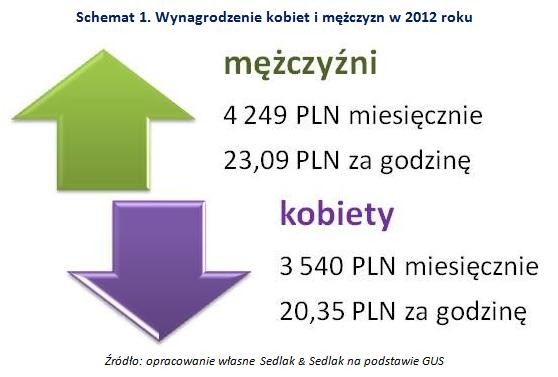 Co ciekawe, dysproporcja była mniej widoczna przy stawkach godzinowych. W przeliczeniu na godzinę, różnica była niższa o 5 p.p. i wyniosła 12%. Godzina pracy kobiety wyceniona była na 20,35 PLN, a mężczyzny na 23,09 PLN. W dużej mierze niższe wypłaty kobiet wynikają więc z mniejszej liczby przepracowanych przez nie godzin. W 2012 roku mężczyzna spędził w pracy średnio 170 godzin miesięcznie, a kobieta o 8 godzin mniej – 162 godziny.