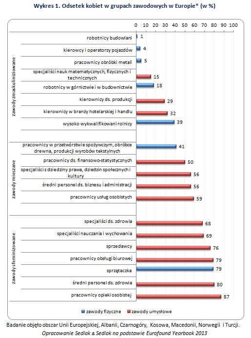 Największy odsetek zatrudnionych kobiet występował w profesjach: sprzątaczka (79 proc. grupy stanowiły kobiety); średni personel ds. zdrowia (80 proc. grupy stanowiły kobiety); oraz pracownicy opieki osobistej (87 proc. grupy stanowiły kobiety).