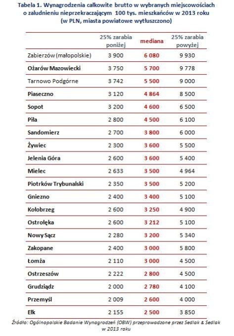 Przeciętne zarobki poniżej 3 000 PLN zanotowano przykładowo w Ełku (2 500 PLN), Przemyślu (2 600 PLN), Grudziądzu (2 780 PLN) i Ostrzeszowie (2 800 PLN). Jedna czwarta pracowników w Grudziądzu, która zarabiała najmniej, otrzymywała pensje poniżej 2 000 PLN.
