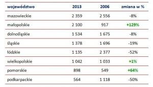 W 2013 roku studia wyższe w Polsce na kierunkach informatycznych ukończyło łącznie 13 725 osób. Prawie co piąty absolwent ukończył uczelnię z województwa mazowieckiego (2 359 osób). Na drugim miejscu znalazło się województwo małopolskie, gdzie dyplom informatyka uzyskało 2 100 osób. Województwa usytuowane na północy kraju znalazły się w dalszej części rankingu, za wyjątkiem pomorskiego, gdzie w 2013 roku odnotowano 898 absolwentów kierunków IT. W 2013 roku najmniej młodych informatyków z dyplomem przybyło w województwach opolskim (263 osób) oraz lubuskim (140 osób). Na przestrzeni lat 2006-2013 jedynie w małopolskim, wielkopolskim i pomorskim odnotowano wzrost liczby absolwentów.