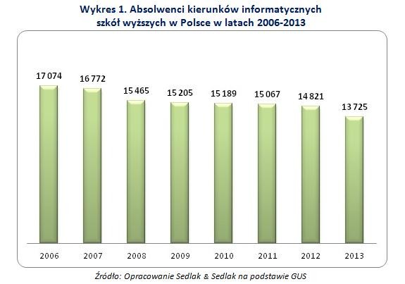 W 2006 roku absolwentów studiów informatycznych było 17 074, natomiast w 2013 roku już o prawie 3 500 mniej.