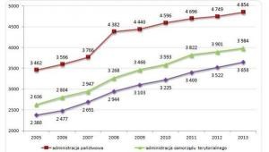 Z kolei urzędnicy administracji państwowej w latach 2005-2013 przeciętnie zarabiali o 41% więcej niż wynosiła średnia krajowa w analizowanym okresie. Ich wynagrodzenie rosło jednak wolniej niż pensje pozostałych Polaków. W 2008 roku przeciętna płaca urzędników państwowych wzrosła aż o 16%, natomiast w pozostałych latach wyraźnie widać spadek dynamiki wzrostu ich wynagrodzeń. W 2013 roku pracownik administracji państwowej zarobił 4 854 PLN, co przewyższa średnią pensję Polaków o 1 204 PLN (33%). W 2008 roku różnica ta wyniosła 1 438 PLN (prawie 50%).