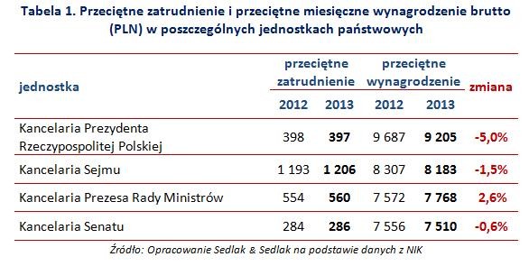 Z kolei najliczniejszy zespół pracował przy wspieraniu polskich posłów: przeciętna liczba pracujących w Kancelarii Sejmu wyniosła 1 206 osób, a średnia płaca była równa 8 183 PLN. Także w tym urzędzie płace w ubiegłym roku spadły – średnio o 1,5% w stosunku do 2012 roku.