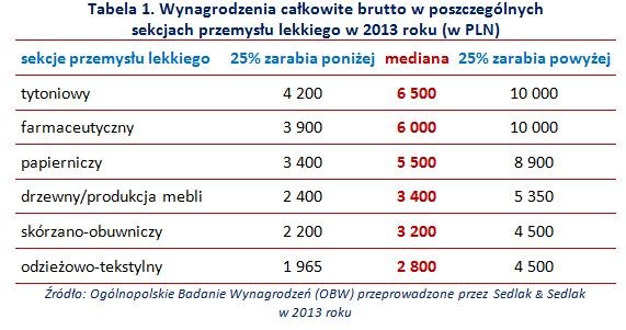 Mediana zarobków w przemyśle lekkim wyniosła w 2013 roku 4 400 PLN brutto miesięcznie. Najniższe wynagrodzenia w branży otrzymywali pracownicy sekcji odzieżowo-tekstylnej. Mediana ich miesięcznych płac wynosiła 2 800 PLN. Niewiele więcej zarabiali zatrudnieni w sekcji skórzano-obuwniczej – 3 200 PLN. Osoby pracujące w przemyśle drzewnym oraz zajmujący się produkcją mebli przeciętnie otrzymywały 3 400 PLN.