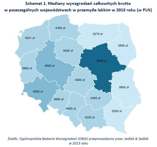 W 2013 roku najwyższe płace w przemyśle lekkim odnotowano w województwach: mazowieckim (6 000 PLN), wielkopolskim (4 620 PLN) i dolnośląskim (4 500 PLN), natomiast najniższe w województwach: podkarpackim (3 200 PLN), warmińsko-mazurskim (3 275 PLN) i podlaskim (3 500 PLN).