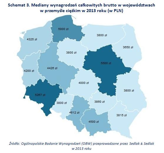 Najwyższe, przekraczające 5 000 PLN wynagrodzenia otrzymywały osoby pracujące na terenie województw: mazowieckiego (5 500 PLN), dolnośląskiego (5 267 PLN) i pomorskiego (5 000 PLN). Działają tam duże przedsiębiorstwa z tych sekcji przemysłu ciężkiego, w których płace są najwyższe. W mazowieckim i pomorskim jest to przemysł petrochemiczny (PKN Orlen, Grupa Lotos S.A.), z kolei w dolnośląskim prosperuje przemysł wydobywczy i motoryzacyjny.