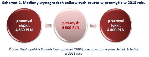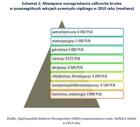 Spośród osób pracujących w przemyśle ciężkim najwyższe wynagrodzenia otrzymywali zatrudnieni w petrochemii. Mediana ich płac wynosiła 6 tys. PLN. O tysiąc złotych mniej zarabiali pracownicy przemysłu motoryzacyjnego i górnictwa. Najniższe wynagrodzenia otrzymywały osoby pracujące w hutnictwie i metalurgii (3 990 PLN).
