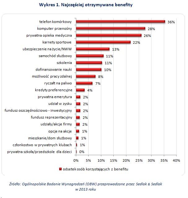 Najpopularniejszymi benefitami w 2013 roku były: telefon komórkowy, komputer przenośny, prywatna opieka medyczna oraz karnety sportowe. Najmniej pracowników otrzymywało dofinansowanie do prywatnej szkoły dla dzieci, członkostwo w prywatnych klubach czy udziały w zysku firmy (w dowolnej formie).