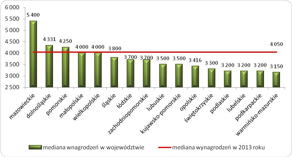 Powyżej mediany dla całego kraju, która według Ogólnopolskiego Badania Wynagrodzeń wyniosła 4 050 zł, zarabiała połowa lepiej wynagradzanych pracowników z województw: dolnośląskiego i pomorskiego. Nieznacznie poniżej mediany krajowej wyniosły mediany dla województw: małopolskiego i wielkopolskiego.