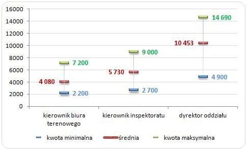 Z kolei przeciętne zarobki kierowników inspektoratu wynoszą 5 730 zł brutto – a maksymalna pensja na tym stanowisku wynosi 9 000 zł brutto. Wynagrodzenie kierownika prowadzącego biuro terenowe mieści się w przedziale od 2 200 do 7 200 zł brutto (średnie zarobki na tym stanowisku wynoszą 4 080 zł brutto). Wszystkie te kwoty dotyczą wynagrodzeń zasadniczych i nie obejmują dodatków.