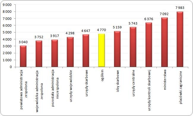 Wśród pracowników i urzędników służby cywilnej zatrudnionych w ministerstwach najwięcej zarabiali ci, którzy znaleźli zatrudnienie w Ministerstwie Spraw Zagranicznych - ich wynagrodzenie wynosiło w 2013 roku średnio 8 298 zł brutto. Nieco mniej, bo 7 779 zł brutto, zarabiali pracownicy Ministerstwa Finansów. Na trzecim miejscu wśród pracowników ministerialnych znalazły się osoby pracujące w Kancelarii Prezesa Rady Ministrów – ich przeciętne miesięczne wynagrodzenie wynosiło 7 702 zł brutto. Najmniej zarabiali natomiast urzędnicy zatrudnieni w Ministerstwie Sprawiedliwości - w 2013 roku ich przeciętne miesięczne wynagrodzenie całkowite wyniosło 5 821 zł brutto.