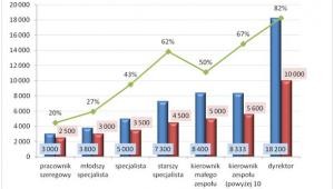 Jeśli chodzi o stanowiska, największe różnice wynagrodzeń występowały wśród dyrektorów. Zatrudnieni w zagranicznych firmach zarabiali o 82% więcej niż dyrektorzy pracujący w firmach polskich. Najmniejsze różnice, wynoszące 20% na korzyść firm zagranicznych, występowały w wynagrodzeniach pracowników szeregowych.