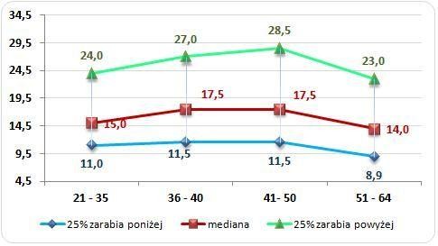 Najlepiej zarabiający pracownicy mieli od 41 do 46 lat i staż pracy wynoszący 11 do 15 lat.