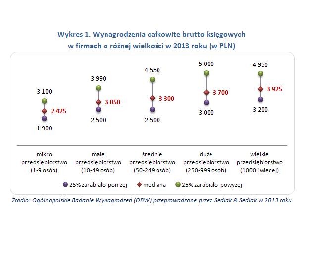 Wśród uczestników XI Ogólnopolskiego Badania Wynagrodzeń zatrudnionych na stanowiskach związanych z księgowością przeważali pracownicy średniej wielkości przedsiębiorstw. Mediana wynagrodzeń młodszych księgowych wyniosła tam 3 008 zł, księgowych 3 300 zł, a w przypadku starszych księgowych 4 283 zł.