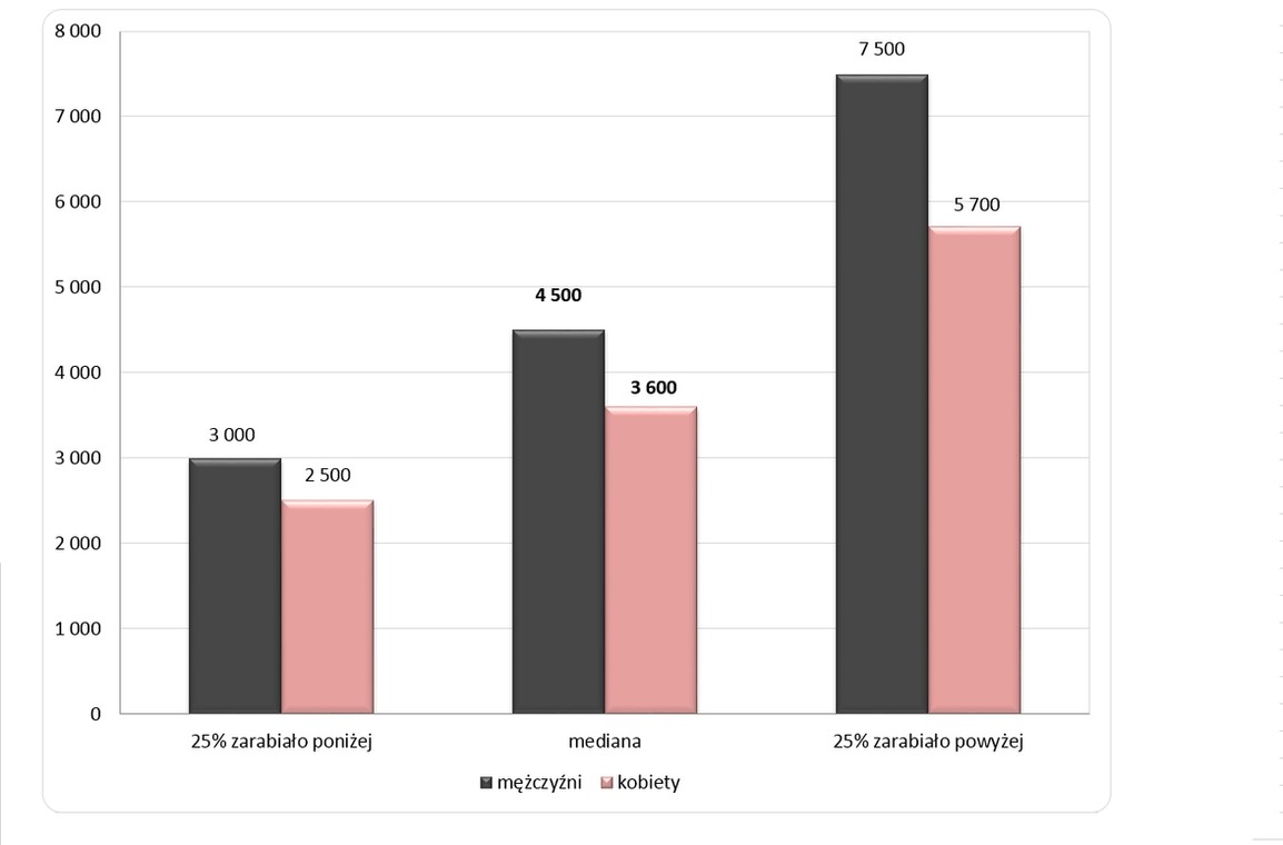 Największe różnice między wynagrodzeniami kobiet i mężczyzn zaobserwowano na szczeblu dyrektora/zarządu. Kobiety zarabiały przeciętnie o 3 200 PLN mniej. Połowa mężczyzn zatrudnionych na stanowisku kierownika zarabiała od 4 400 PLN do 10 000 PLN. Kobiety otrzymywały pensję na poziomie 5 800 PLN.