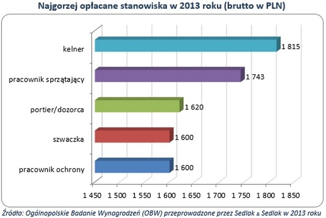 Jak wynika z Ogólnopolskiego Badania Wynagrodzeń, mediana wszystkich uczestników badania wynosiła 4 050 PLN brutto. W 2013 roku najmniej zarabiały szwaczki i pracownicy ochrony. Zatrudnieni na tych stanowiskach otrzymywali wynagrodzenie na poziomie płacy minimalnej obowiązującej w 2013 roku (1 600 PLN brutto).