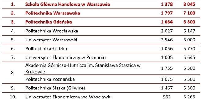 Jak wynika z XI Ogólnopolskiego Badania Wynagrodzeń, najwyższe płace w 2013 roku otrzymywali absolwenci Szkoły Głównej Handlowej. Mediana ich wynagrodzeń całkowitych brutto wynosiła 4 200 PLN. Nieco niższe płace otrzymywały osoby, które uzyskały dyplom ukończenia Uniwersytetu Ekonomicznego w Poznaniu. Przeciętnie zarabiali oni 3 725 PLN. Na trzecim miejscu w rankingu uczelni uplasowały się ex aequo Politechnika Warszawska i Uniwersytet Warszawski. W 2013 roku wynagrodzenia „świeżo upieczonych” absolwentów tej uczelni wynosiły 3 500 PLN.