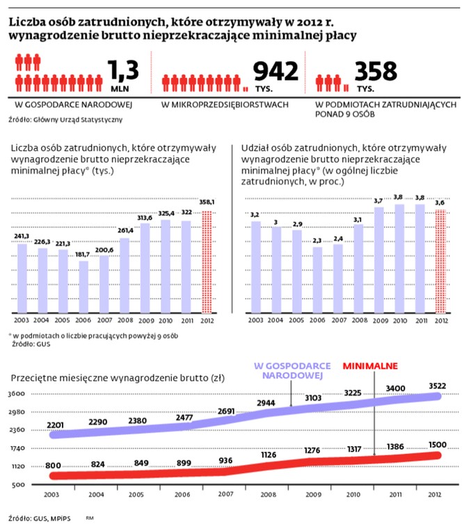 1,3 mln Polaków dostawało w 2012 r. nie więcej niż 1500 zł brutto. Tych osób jest aż dwa razy więcej, niż do tej pory szacowali eksperci. Dotychczas pewne było jedynie to, że minimalną pensję otrzymuje ok. 358,1 tys. pracowników firm zatrudniających ponad 9 osób. Poznaliśmy pierwsze opracowanie GUS, które analizuje zjawisko w skali całej gospodarki.