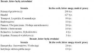 Wzrost zatrudnienia ma najbardziej odczuć branża produkcyjna. W tym sektorze gospodarki, ze względu na niską bazę, prace może znaleźć nawet 290 tysięcy osób. Dobrze perspektywy ma również transport i logistyka. Wzrost zatrudnienia wyniesie tam prawie 100 tysięcy osób.