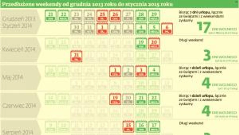 W nowym roku tradycyjnie wypadnie kilka długich weekendów. Dwa z nich będą rozliczane przez pracodawców w szczególny sposób, bo dni świąteczne będą przypadać w soboty (3 maja i 1 listopada), które dla większości pracowników są wolne z tytułu realizacji zasady przeciętnie pięciodniowego tygodnia pracy. Zgodnie z obowiązującym prawem firmy muszą udzielić wypoczynku za święto przypadające w taki dzień. O tym, kiedy zatrudnieni odbiorą wolne, decyduje pracodawca. Musi się on jednak rozliczyć z pracownikiem w odpowiednim okresie, który w większości firm wynosi maksymalnie 4 miesiące. Trzeba pamiętać, że przedsiębiorstwa, które zawarły porozumienie na podstawie nowych przepisów pozwalających na elastyczne rozliczanie czasu pracy, będą miały na to nawet 12 miesięcy.