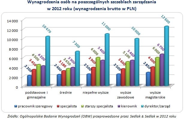 Najmniejsze różnice w płacach na poszczególnych szczeblach zarządzania w 2012 roku były charakterystyczne dla pracowników szeregowych i specjalistów. Pracownik szeregowy z wykształceniem podstawowym zarabiał przeciętnie 2 200 PLN. Osoba zatrudniona na tym samym szczeblu, ale legitymująca się wykształceniem magisterskim zarabiała 2 850 PLN. Największe zróżnicowanie wynagrodzeń było charakterystyczne dla najwyższego szczebla – dyrektorów i członków zarządu. Choć co ciekawe, najniższe wynagrodzenie na tym szczeblu otrzymywały osoby z wykształceniem średnim (7 300 PLN). Zrządzający z wykształceniem wyższym magisterskim zarabiały w 2012 roku 12 600 PLN.