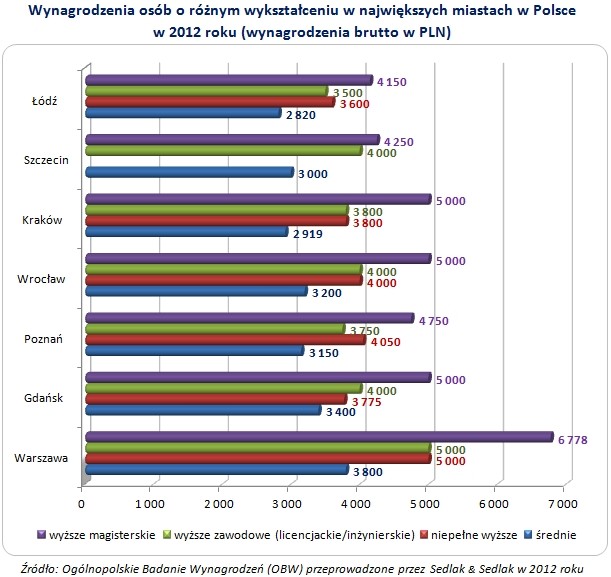 Wynagrodzenia osób o różnym wykształceniu pracujących w największych miastach w Polsce przedstawiono na wykresie 4. W 2012 roku absolwenci studiów magisterskich najwięcej zarabiali w Warszawie (6 778 PLN) oraz w Gdańsku, Wrocławiu i Krakowie (po 5 000 PLN). Najniższe wynagrodzenia magistrów odnotowano natomiast w Łodzi (4 150 PLN). Podobnie wygląda geograficzne zróżnicowanie zarobków osób o niższym wykształceniu.