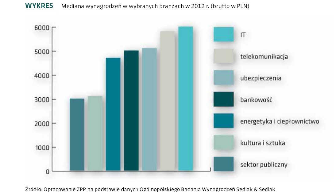 Biorąc pod uwagę średnie zarobki na szeregowych stanowiskach, najwyższe wynagrodzenia w 2012 roku odnotowano w branży IT oraz telekomunikacji. Według danych OBW mediany miesięcznych wynagrodzeń brutto wyniosły odpowiednio 6 tys. i 5,8 tys. PLN brutto. Płace w tej branży są dość zróżnicowane i zależą od wielkości firmy oraz regionu, w którym jest ona ulokowana. Płace powyżej 5 tys. PLN odnotowano również w branży finansowej. Najmniej zarabiają natomiast zatrudnieni w służbie zdrowia, administracji, kulturze i nauce oraz sektorze organizacji pozarządowych. Mediana wynagrodzeń w sektorze publicznym wyniosła 3 tys. PLN.