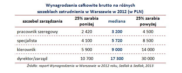 Pracownicy szeregowi zatrudnieni w Warszawie zarabiali w 2012 roku przeciętnie 3 200 PLN. Mediana wynagrodzeń specjalistów wynosiła 5 720 PLN. Niemal dwukrotnie więcej zarabiali kierownicy. Mediana ich wynagrodzenia całkowitego brutto wynosiła 9 000 PLN. Osoby na najwyższym szczeblu, dyrektorzy oraz osoby zasiadające w zarządzie zarabiały przeciętnie 17 300 PLN.