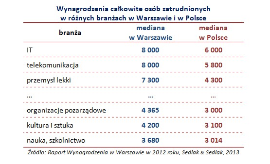 Nie tylko w Warszawie, ale również na terenie całej Polski, branża IT była jedną z najlepiej opłacanych branż. Mediana wynagrodzeń całkowitych osób w niej zatrudnionych na terenie stolicy wyniosła 8 000 PLN. Równie wysokie płace otrzymywali pracownicy telekomunikacji. O 700 PLN mniej zarabiały osoby zatrudnione w przemyśle lekkim. Najniżej opłacani byli pracownicy nauki i szkolnictwa (3 680 PLN), kultury i sztuki (4 200 PLN) oraz organizacji pozarządowych (4 365 PLN).