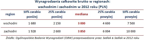 W 2012 roku przeciętne płace na wschodzie Polski kształtowały się na poziomie 3 000 PLN brutto, podczas gdy w rejonie zachodnim wynosiły one 3 850 PLN – wynika z Ogólnopolskiego Badania Wynagrodzeń przeprowadzonego przez Sedlak & Sedlak.