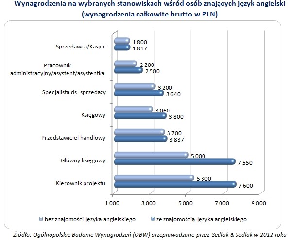 Czy znajomość języka angielskiego zwiększa szanse na wysokie płace? – Nożyce pomiędzy osobami nieznającymi tego języka, a władającymi nim w stopniu co najmniej dobrym rozwierają się w miarę awansu zawodowego. Pracownik szeregowy zyskuje przeciętnie 150 PLN brutto, a specjalista 600 PLN miesięcznie. Pracodawca płaci jednak za te kompetencje, z których korzysta się w pracy. Zatem liczy się nie tylko znajomość języka obcego, ale przede wszystkim władanie nim na co dzień – komentuje Łukasz Pokrywka z Sedlak & Sedlak.