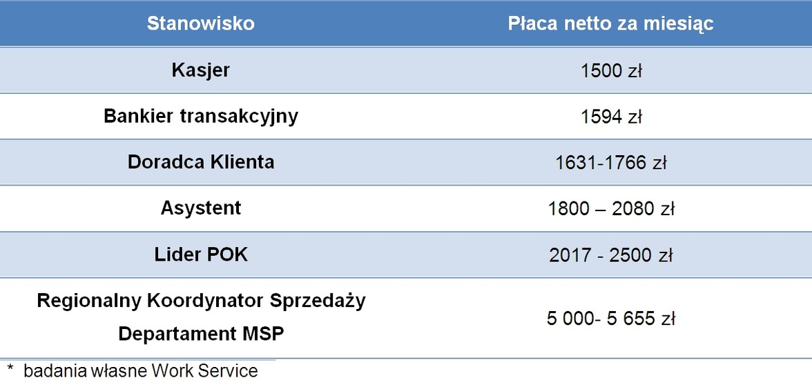 W najnowszym raporcie Work Service analizuje wynagrodzenia pracowników banków, które na większości stanowisk nie są najwyższe. – Najmniej zarabia kasjer oraz bankier. Są to kwoty w przedziale 1500-1600 zł na rękę. Jeśli liczymy na wyższe wynagrodzenie powinniśmy starać się o stanowisko asystenta lub lidera Punktu Obsługi Klienta. Kilkukrotnie więcej zarobi Regionalny Koordynator Sprzedaży – od 5000 zł do 5 655 zł w zależności od województwa, jednak praca ta wymaga mobilności, umiejętności sprzedażowych i sporego doświadczenia. Wszystkie stanowiska są jednak gorzej płatne w porównaniu do członków zarządu, których pensje oscylują w granicach 100 – 200 tysięcy złoty miesięcznie – podpowiada Krzysztof Inglot.