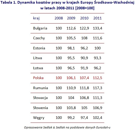 Wynagrodzenia oraz pozapłacowe koszty pracy w Bułgarii w latach 2008-2011 zwiększyły się o 33,4%. Stosunkowo duży przyrost kosztów zatrudnienia miał miejsce również w Rumunii (+17,3%), Polsce (+12,5%) oraz Czechach (+11,6).
