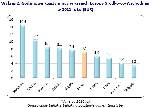 Warto jednak zaznaczyć, że Bułgaria i Rumunia to wciąż kraje o najniższych kosztach pracy na Starym Kontynencie. Według danych Eurostat-u, w 2011 roku, za godzinę pracy pracodawcy musieli zapłacić tam odpowiednio 3,5 EUR i nieco ponad 4 EUR. W naszym kraju godzinowe koszty pracy w 2011 roku wyniosły 7,1 EUR, w Czechach 10,5 EUR, na Słowacji 8,4 EUR, w Słowenii 14,4 EUR, na Węgrzech 7,6 EUR, Estonii 8,1 EUR, Łotwie 5,9 EUR oraz Litwie 5,5 EUR. Dla porównania w Norwegii, w której praca jest najdroższa na całym kontynencie, w 2011 roku pracodawcy musieli za godzinę pracy zapłacić aż 44,2 EUR. Nieco niższy wskaźnik kosztów pracy odnotowały Belgia (39,3 EUR/h), Szwecja (39,1/h) oraz Dania (38,6 EUR/h).