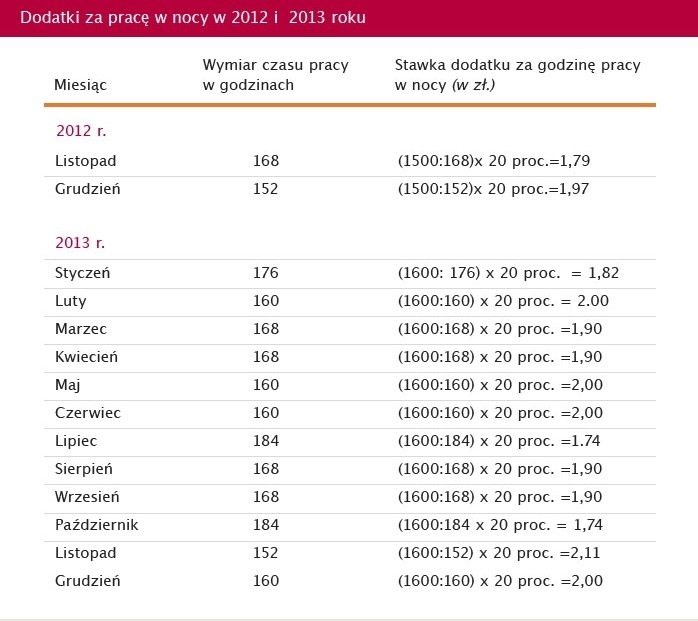 Powrót do starego sposobu liczenia wymiaru czasu pracy niewątpliwie ułatwi życie wielu pracodawcom. Nie tylko dlatego, że – o czym wspomniano wcześniej – zwolni ich z obowiązku ustalania kilku, zamiast jednego, nominalnego czasu pracy. Teraz wszystkich zatrudnionych obowiązuje już bowiem jeden wymiar czasu pracy (patrz tabela 1). Ułatwi im także rozliczanie pracy wykonywanej w porze nocnej. Dzięki temu, że wszystkich pracowników obowiązuje ten sam nominalny czas pracy, wszystkim przysługiwać będzie jednakowy dodatek za taką pracę. Wynosi on bowiem 20 proc. stawki godzinowej, wynikającej z płacy minimalnej (patrz tabela 2).