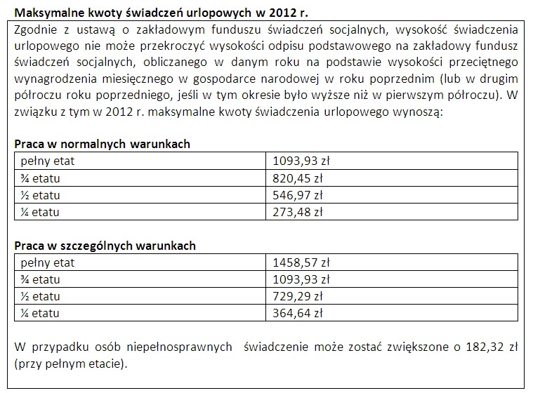 Na jakie „kieszonkowe” może liczyć się osoba wybierająca się na urlop? W tym roku maksymalnie na 1093,93 zł, jeśli pracuje na pełnym etacie. Jeśli wymiar czasu pracy jest niższy, świadczenie jest odpowiednio zmniejszane, na przykład w przypadku pracy na pół etatu maksymalna kwota świadczenia wynosi połowę wspomnianej wcześniej kwoty, czyli 546,97 zł. W przypadku osób, które wykonują pracę w szczególnych warunkach (dotyczy to np. pracy pod ziemią lub pod wodą czy bardzo ciężkiej pracy fizycznej), maksymalna kwota świadczenia urlopowego dla osób na pełnym etacie wzrasta do 1458,57 zł. Natomiast w przypadku pracowników młodocianych bierze się pod uwagę rok nauki (np. w pierwszym roku świadczenie wynosi 145,86 zł). Należy jednak pamiętać, że ponieważ są to maksymalne pułapy, faktyczne świadczenie w danej firmie może być niższe, w zależności od decyzji pracodawcy.