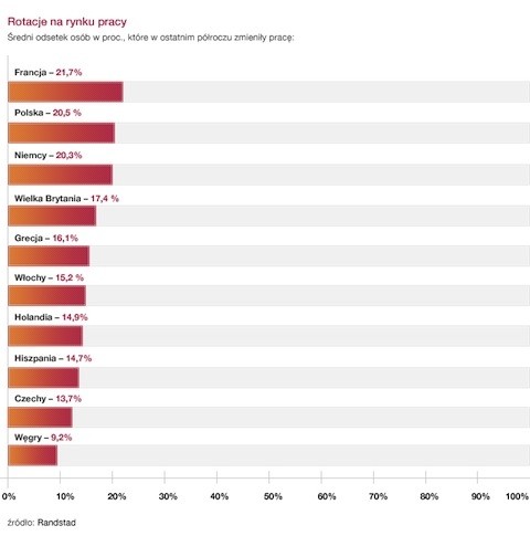 Z najnowszych badań przeprowadzonych w Szkole Wyższej Psychologii Społecznej w Warszawie wynika, że polscy jumperzy ( jumperami, czyli skoczkami nazywa się osoby często zmieniające pracę - red.) to głównie humaniści. Aż 2/3 absolwentów kierunków humanistycznych zmienia pracodawcę przed upływem roku od momentu zatrudnienia. Powyżej 3 lat w swojej pierwszej pracy pozostaje zaledwie 2 proc. z nich. Wśród inżynierów wygląda to trochę inaczej. W tej grupie osób w pierwszej pracy przepracowuje ponad trzy lata co czwarty. Ale to marne pocieszenie biorąc pod uwagę fakt, że w Polsce swoje kompetencje zawodowe po zakończeniu nauki podnosi zaledwie 5 proc. młodych ludzi, podczas gdy średnia europejska wynosi 9,3 proc. Efekt tego jest taki, że blisko 40 proc. polskich magistrów i inżynierów podejmuje swoją pierwszą pracę nie w wyuczonym zawodzie, ale tam, gdzie ją dostaną. W Niemczech jest to tylko 6 proc.