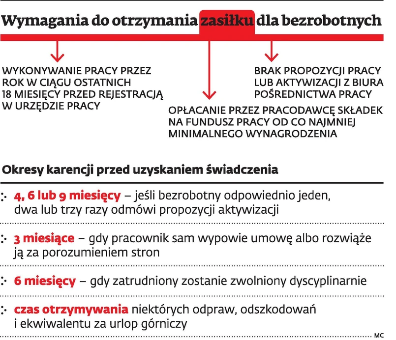 świadectwo pracy z adnotacją, że stosunek pracy został rozwiązany na mocy porozumienia stron z dodatkową informacją, iż nastąpiło ono z przyczyn niedotyczących pracownika lub dotyczących pracodawcy, zasiłek przysługuje po upływie 7 dni od zarejestrowania w urzędzie pracy – potwierdza Jolanta Siwak, zastępca dyrektora ds. organizacyjnych tego urzędu.