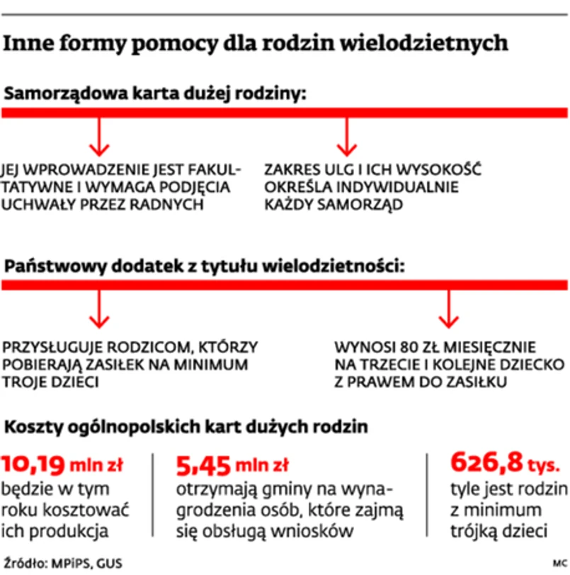 Zastrzeżenia części samorządów budzi też kwota dotacji, jaką mają otrzymać za realizację procedur związanych z wydawaniem kart. Rząd wyliczył, że będzie to 8,93 zł na obsługę całej rodziny wielodzietnej. Jeżeli karta ma jednocześnie potwierdzać uprawnienia do lokalnego programu wspierania, gmina otrzyma połowę tej kwoty.